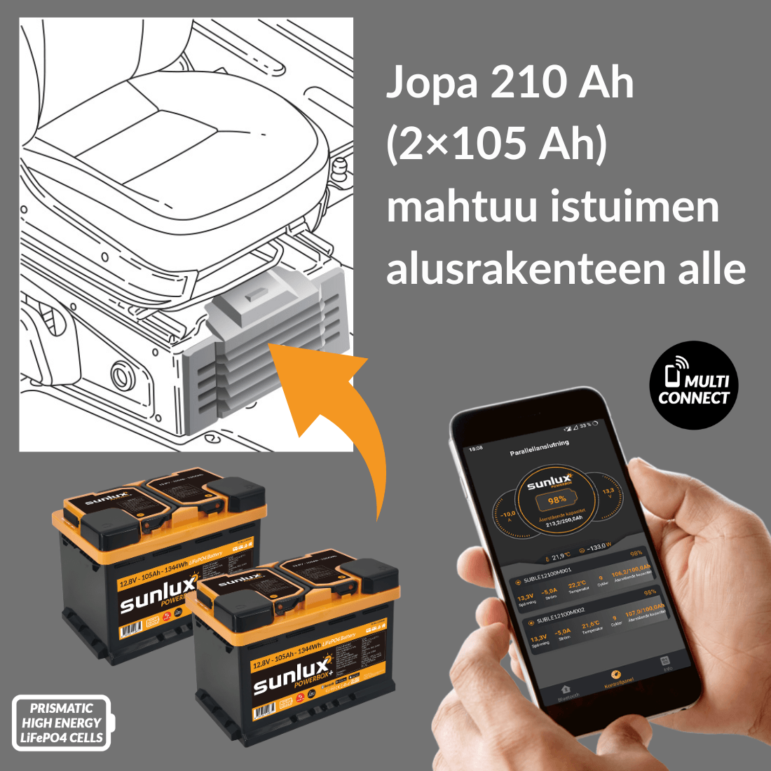 Sovelluksen uuden”Multi Connect”-toiminnon avulla rinnakkain kytketyistä akut saa yhteen koottua näkymää kaikkien akut enintään 4 kpl) toimintatiedoista.